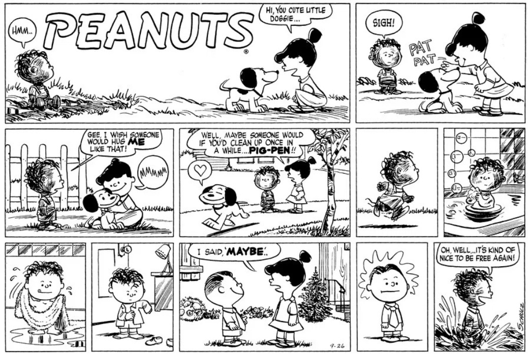 Another early member of the cast was “Pig-Pen,” who made his untidy first appearance (usually with quotes around that nickname) on July 13, 1954. (The Peanuts Movie, 2015, has his real name as James Evans.)