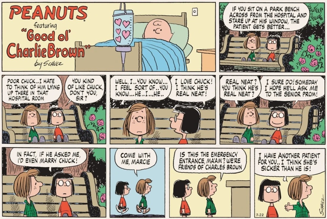 Her very best moments in the strip were those spent with Marcie, who called Patty “sir.” And both she and Marcie were attracted to “Chuck,” with Marcie not being shy about her feelings.