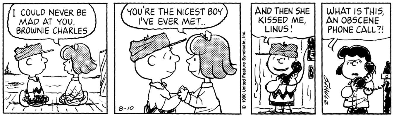 Getting back to the red-haired love of Charlie Brown’s. Though she seemed unforgettable, she was forgotten when he met another beautiful young miss. She also fell in love with him and presented him with his first kiss!