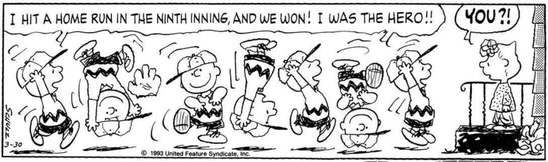 By the way, Schulz also softened on letting Charlie Brown win a baseball game. (Actually, he did win one before by getting a walk, but this time it was by hitting a home run in the ninth inning!)