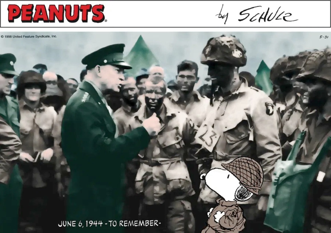 While the Peanuts’ strip (and animated specials) have celebrated holidays such as Halloween, Thanksgiving, and Christmas with great fun, there were serious days that Schulz saluted several times in the strips — Veterans Day and the anniversary of June 6, 1944, when the Allied troops set foot on the shores of Normandy in World War II. Schulz had been a staff sergeant in the Army during the war and fought in France and Germany, including liberating the Dachau concentration camp where some of the worst atrocities in mankind’s history were carried out.