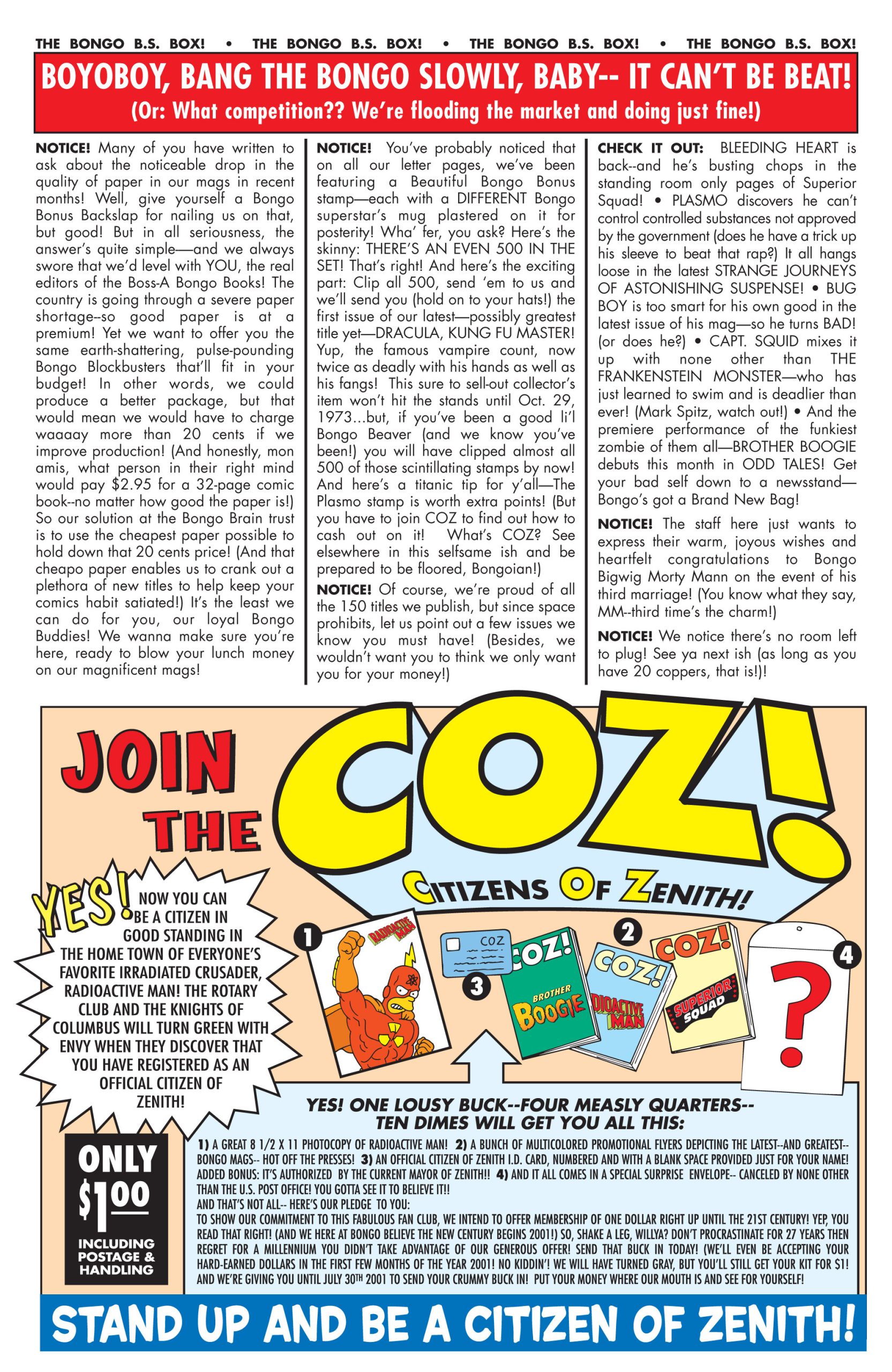 As it turned out, most of our readers either didn’t bother to read the ad, or didn’t believe the offer was still good. We were prepared to print dozens of kits, maybe even hundreds. But we only received a few takers, making the Radioactive Man COZ Fan Club Kit probably the rarest of the rare when it comes to Bongo collectibles!