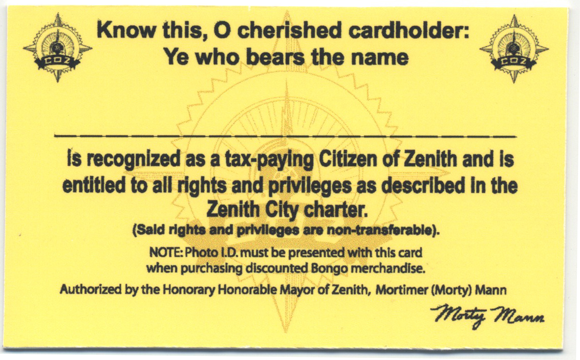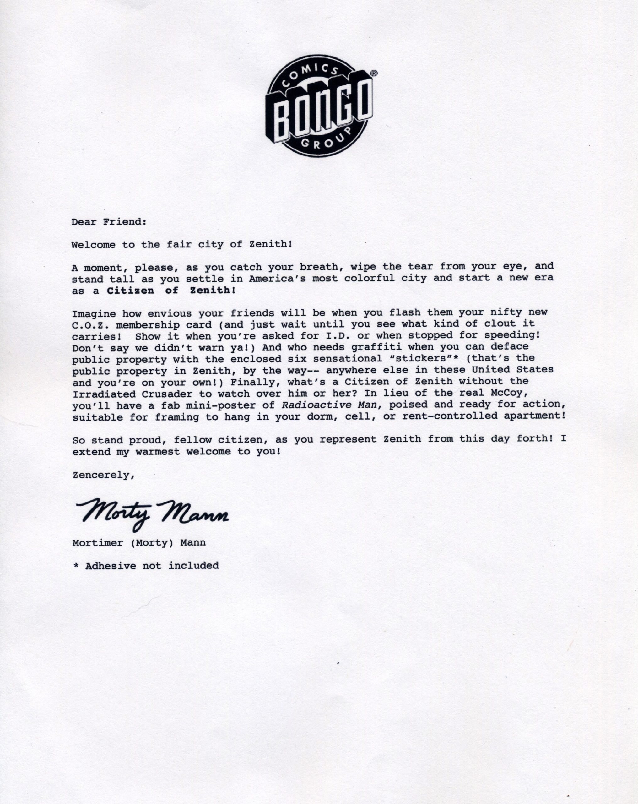 I got approval for a limited number of items that we could produce cheaply, in-house, so the F.O.O.M. poster became a low budget 8” x 10” photo print, and the stickers were replaced by non-sticky ink-jet printed “flyers” of the same size. We did have a membership card that a Bongo employee had to print out and cut on a paper cutter, and a printed envelope, plus a letter from Radioactive Man’s imaginary creator, Morty Mann himself, printed on a Bongo letterhead. Sadly, the budget was not there for a COZ magazine, but all-in-all, it was a pretty nifty kit!