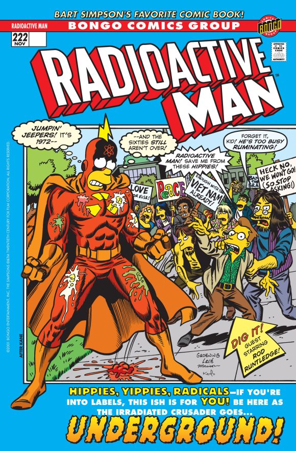 Back in the Bongo Age of Comics, I had the good fortune to work with Batton Lash as his editor on our Eisner Award-winning Radioactive Man series. From the very first issue, Radioactive Man’s mission was to parody the history of comics, and in 2000 I had asked Bat to write the rebooted adventures of the Atomic Avenger in a new series because he really knew his onions when it came to comics history.