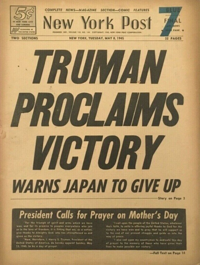 So, let’s set the scene: The Nazis, 13 years after their inexorable rise to power, fell to the Allies. On May 8, at 9 a.m. ET, President Harry S. Truman announced Germany’s surrender, marking the end of World War II in Europe. “I call upon the people of the United States, whatever their faith, to unite in offering joyful thanks to God for the victory we have won and to pray that He will support us to the end of our present struggle and guide us into the way of peace,” his proclamation read. “I also call upon my countrymen to dedicate this day of prayer to the memory of those who have given their lives to make possible our victory.”
