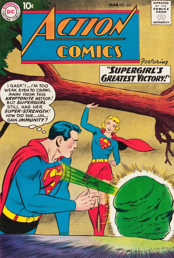 Action Comics #262, DC. Here’s what I’d like to know: Just how much Kryptonite was on Earth back then, anyway? I mean, it was so plentiful, it must have been the cheapest mineral on the planet. Also, Supergirl wasn’t even around for a year yet. Just pointing that out.