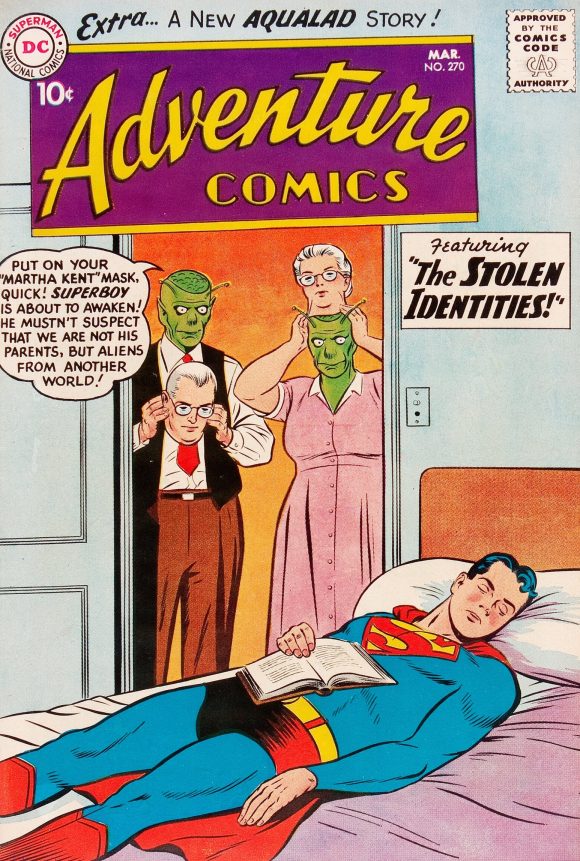 Adventure Comics #270, DC. Not sleeping in your costume is kind of Lesson One in the secret-identity department, Clark. Oh, and your parents are ghoulish aliens.