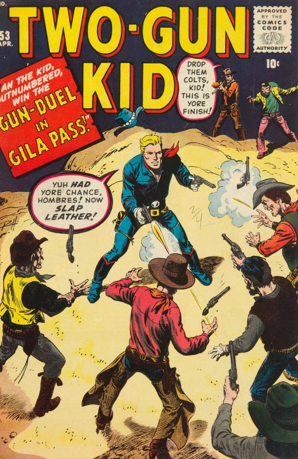 Two-Gun Kid #53, Atlas. I’m willing to buy that Two-Gun Kid shot the guns out of the hands of two banditos, but that guy on the left is clearly just clumsy.