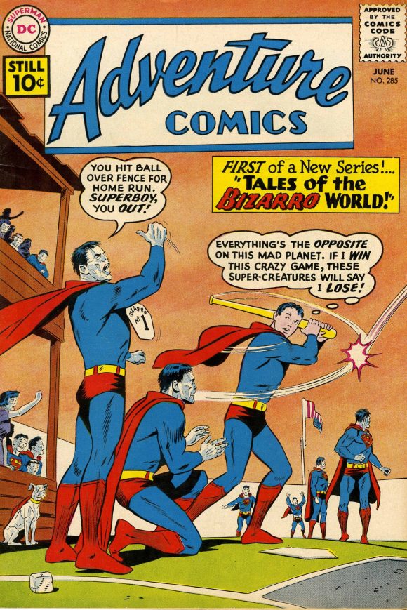 Adventure Comics #285, DC. The introduction of that most Silver Age of Silver Age features — Tales of the Bizarro World! In this opening story, Bizarro Jr. brings shame to his family by being — gasp! — too smart! Plus, Bizarro Krypto makes the scene! James Gunn take note!
