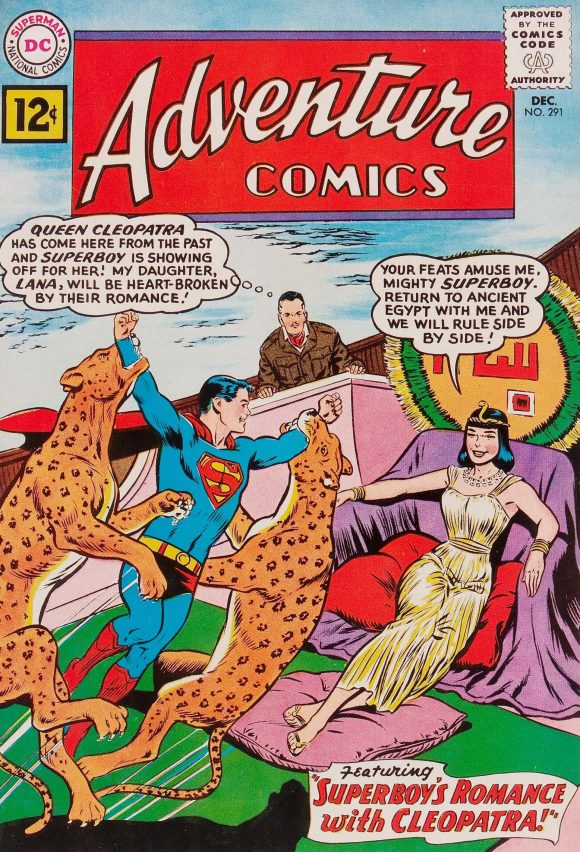 Adventure Comics #291, DC. Look, I’ll go along with Cleopatra somehow arriving from the past, and I’m even OK with Superboy rasslin’ leopards to try and impress her. But why is Lana Lang’s dad on the cover?