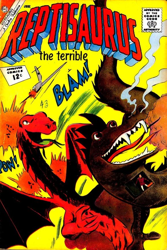 Reptisaurus #5, Charlton. The outfit out of Derby, Conn., had a thing for adapting schlock monster flicks, and this one is based on the 1961 Danish (!) Godzilla knockoff Reptilicus.