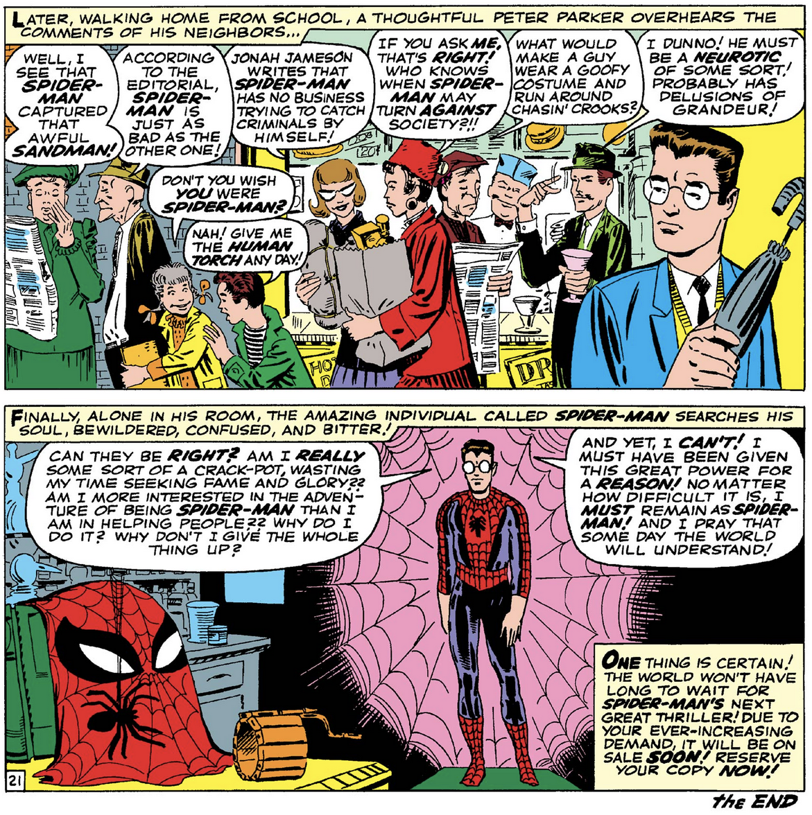 Dan adds: And here’s an excellent example of why Spidey — and Marvel — caught on like it did. The last two panels of the story, written by Stan Lee: