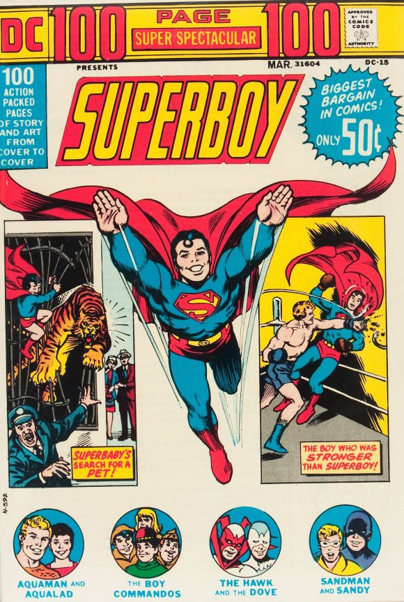 100-Page Super Spectacular DC-15, DC. Superboy gets the lead billing, but the ish includes the Boy Commandos, Aquaman and Aqualad, Hawk and Dove, Sandman and Sandy, and Dial H For Hero. What an eclectic selection of kids! All for 50 cents! Thank you, E. Nelson Bridwell!