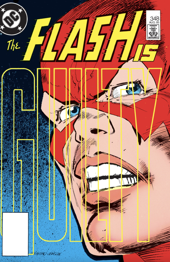 The Flash #348, DC. Guilty! The two year Trial of the Flash reaches its climax — by Cary Bates, Carmine Infantino and Frank McLaughlin, including an Infantino/Klaus Janson cover — with the Scarlet Speedster found guilty (just like the cover says) of the murder of the Reverse-Flash. An era was ending: only two issues left in this series, then Barry Allen would next appear in Crisis on Infinite Earths. And we all know what happened there.