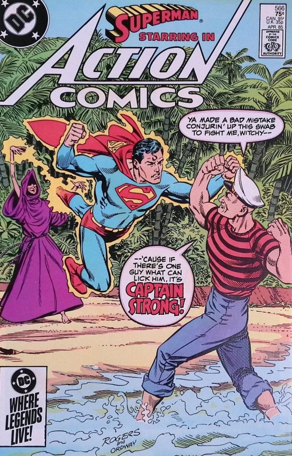 Action Comics #566, DC. You have to love it whenever Popeye — I mean, “Captain Strong” — shows up. That cover, by the way, is by the rather strange pairing of penciller Marshall Rogers and inker Jerry Ordway.