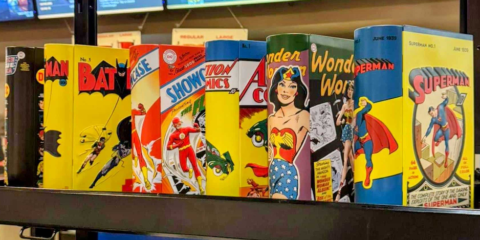 Now, to celebrate DC’s 90th anniversary (which was actually in 2025), the publisher and AMC Theatres have teamed up for a series of six tins that look like omnibi, with classic covers from the Golden, Silver and Bronze Ages. They also come with lanyards featuring other great covers.