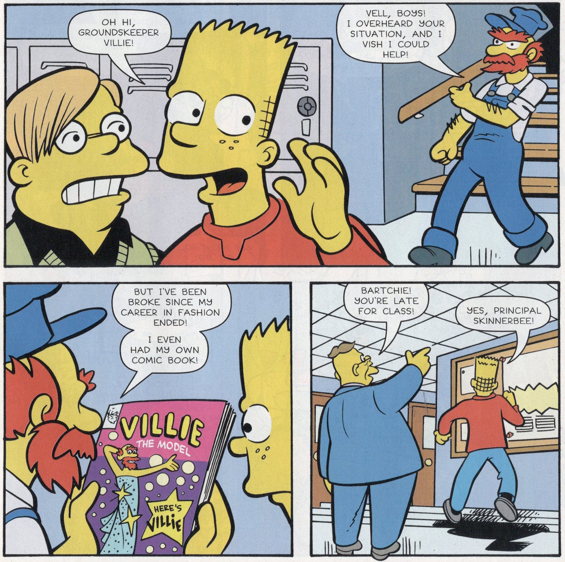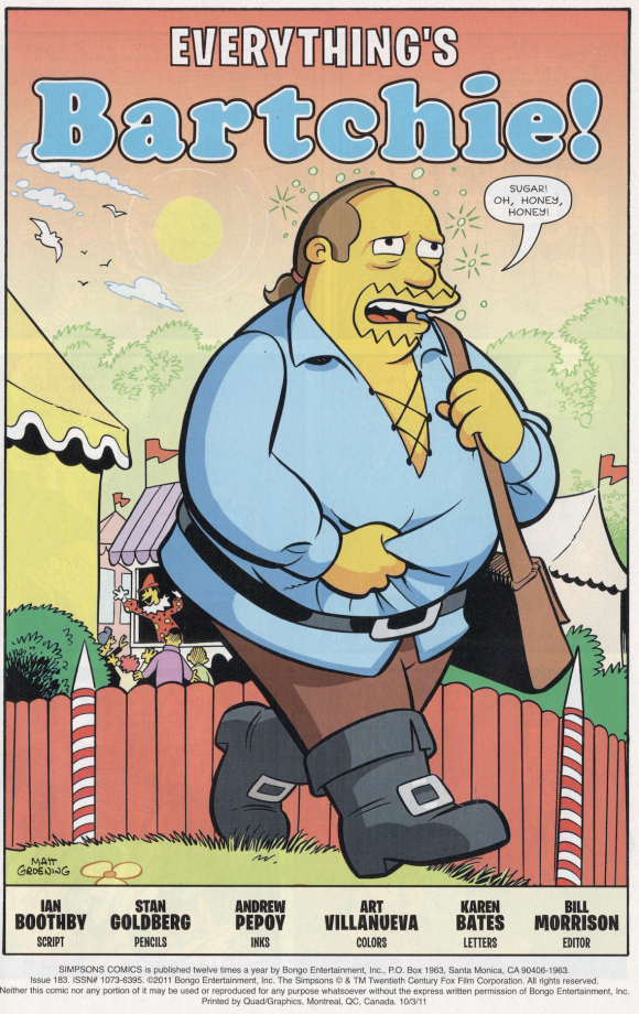 So, we called Simpsons scribe extraordinaire, Ian Boothby, and asked him to write a parody of Archie comics, made to order for Stan. Ian took the ball and ran with it, delivering a hilarious sendup of the denizens of Riverdale. Naturally, Stan got all the jokes, and his depictions of the inhabitants of Springfield masquerading as Archie characters was absolutely perfect! Andrew Pepoy’s inks, Art Villanueva’s colors, and Karen Bates’ lettering weren’t too shabby either! The results can be found in Simpsons Comics #183, and it has become one of my most favorite editing efforts!