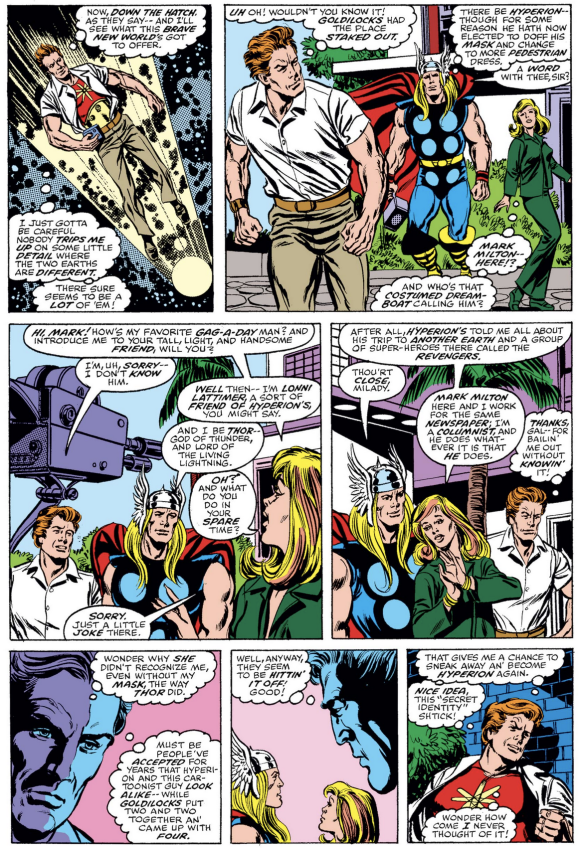 Lonni Lattimer (Thor #280, 1978, Marvel). She was the paramour of Hyperion, another Marvel Superman analogue, and lived out her life on Earth-712 as a, yep, reporter for a great metropolitan newspaper until her demise — off-pane l— years later. Lonni, we hardly knew ye. Great name, though.