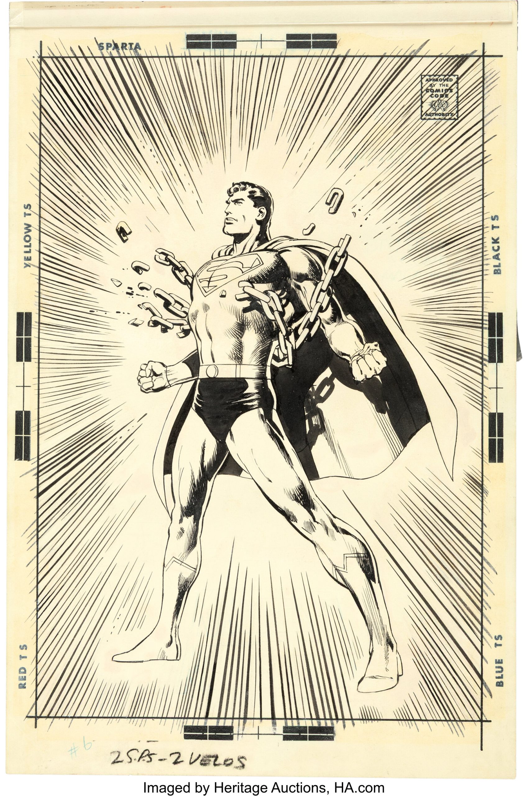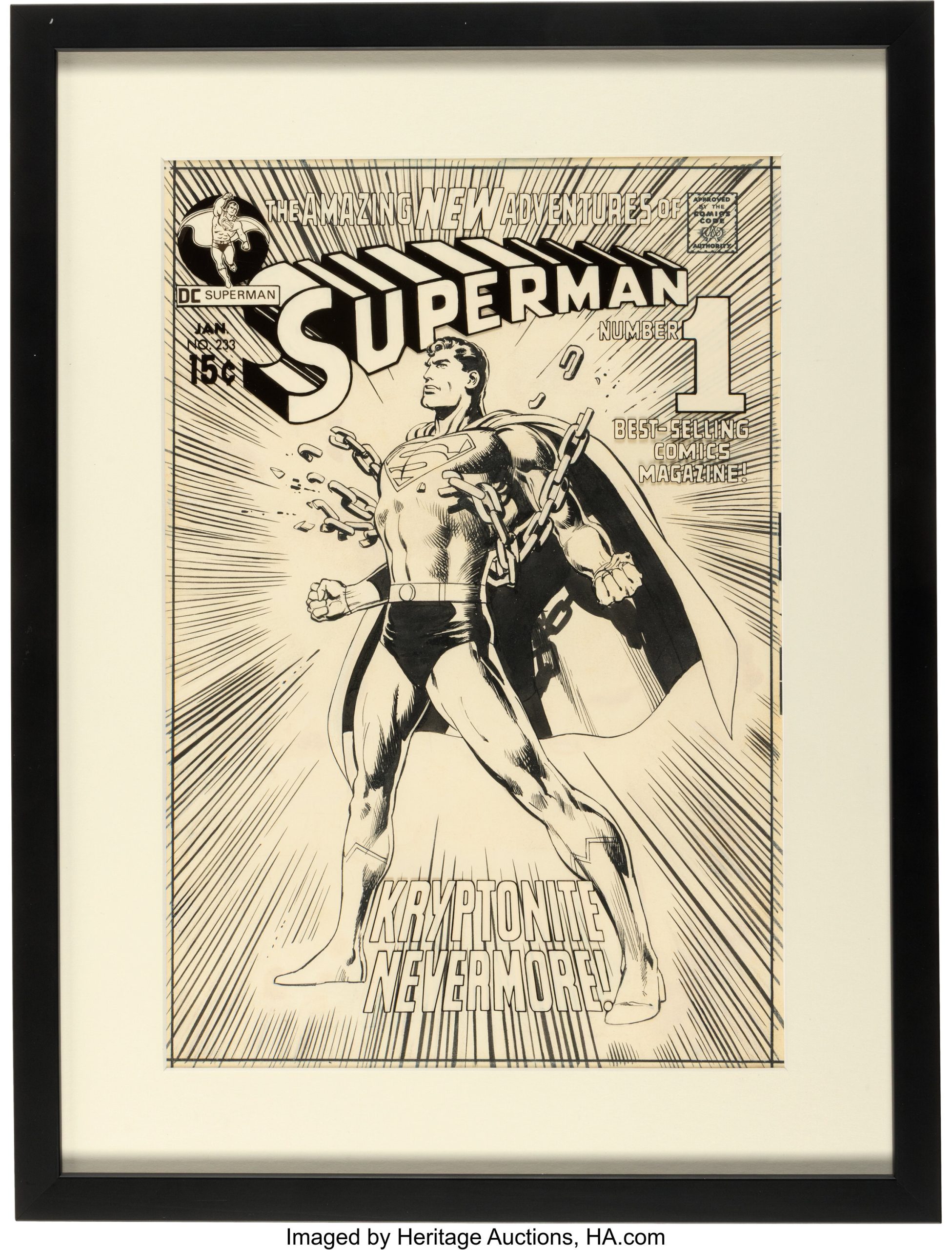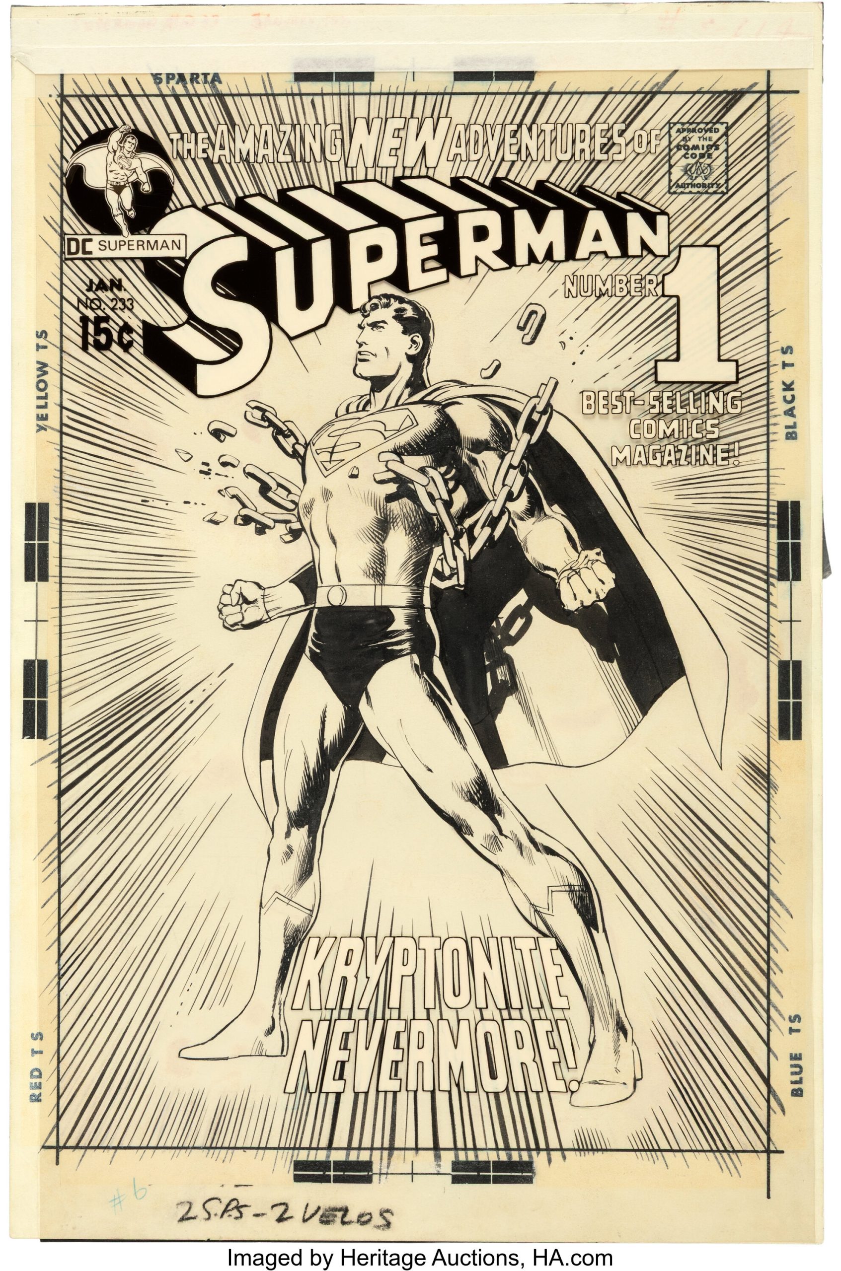 Neal Adams Superman #233 Cover Original Art (DC, 1971). One of the most enduring images in comics history, Neal Adams’ cover of Superman bursting his Kryptonite chains is instantly recognizable even to non-comic fans. DC has kept it in near-constant circulation, plastered on posters, T-shirts, mugs, and yes, even trash cans.
