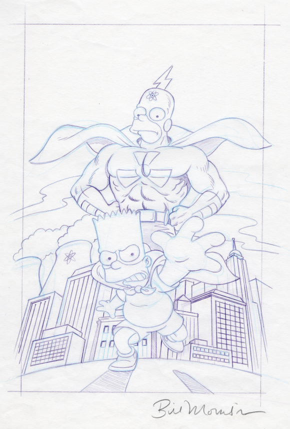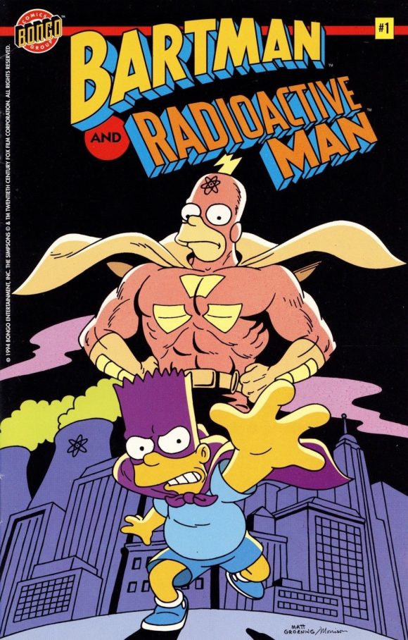 Back in 1993 when Steve Vance, Cindy Vance, Matt Groening, and I were launching Bongo Comics, I was asked to come up with an image for an ashcan-size comic that would reprint our Bartman story from the pre-Bongo Simpsons Comics and Stories #1. The mini-comic, Bartman and Radioactive Man, was to be a promotional insert in an issue of Hero Illustrated magazine. In this story, Bartman doesn’t team up with Radioactive Man, but the Irradiated Crusader is there in a big way, as inspiration for the fledgling hero. So, I wanted to draw a cover that featured Radioactive Man prominently without showing the two characters interacting.
