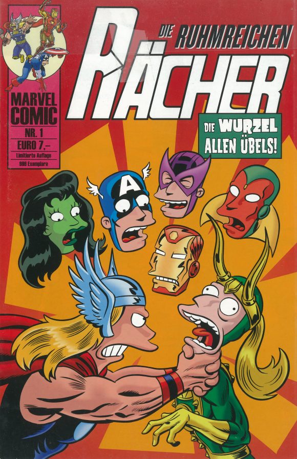 And I finally did get to do a full cover image for the story! I was set to attend a comics festival in Germany at the request of Dino, Bongo’s publishing partner in Deutschland, and they wanted to have a special comic by me for the event. Since they also published Marvel comics, they chose to do a reprint of my Avengers story and asked me to draw a custom cover!
