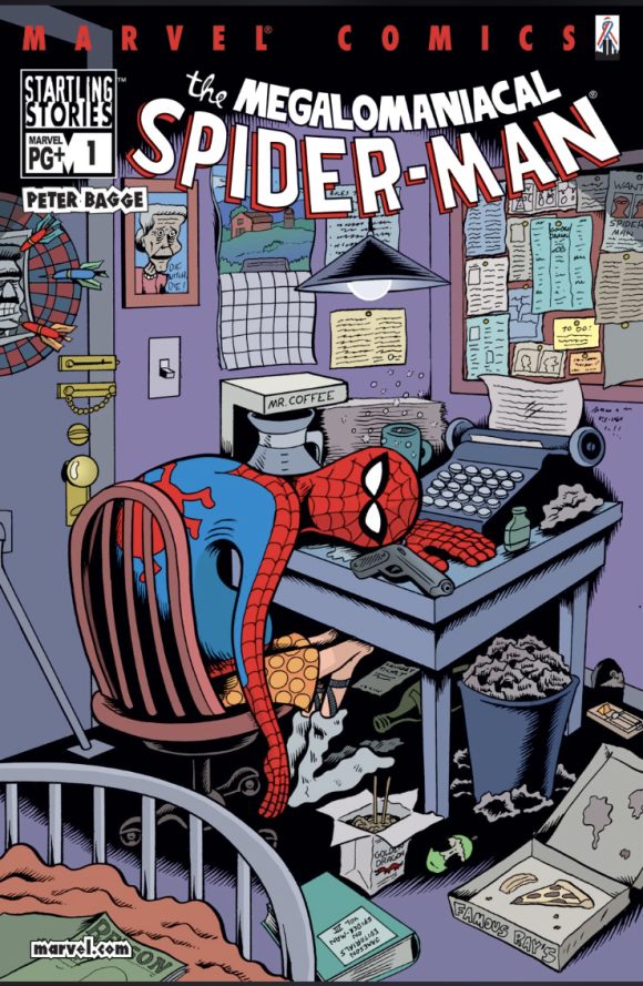Within a few weeks, Matt Groening came into my office and asked if I’d heard about the new Spider-Man one-shot by Peter Bagge, The Megalomaniacal Spider-Man. Matt and I were both fans of Peter’s Hate comic, and I could see that Matt was excited about seeing what he would do with Ol’ Webhead. Matt directed me to a website on my computer that had a preview of the book, and we spent a few minutes gushing about how cool it was to see Spidey done in Bagge’s underground, cartoony style.