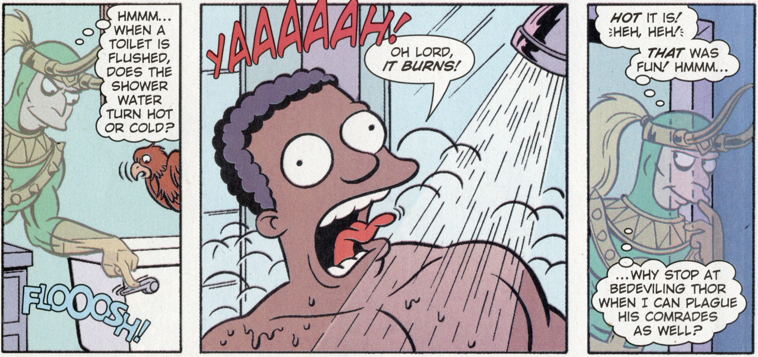 For Loki’s pranks, I had him employ all the classic practical jokes of my youth, but on an Asgardian scale! Unwanted pizza delivery? Check! Flaming bag of dog poop on the front stoop? Check! Prank phone calls? Check and double check!