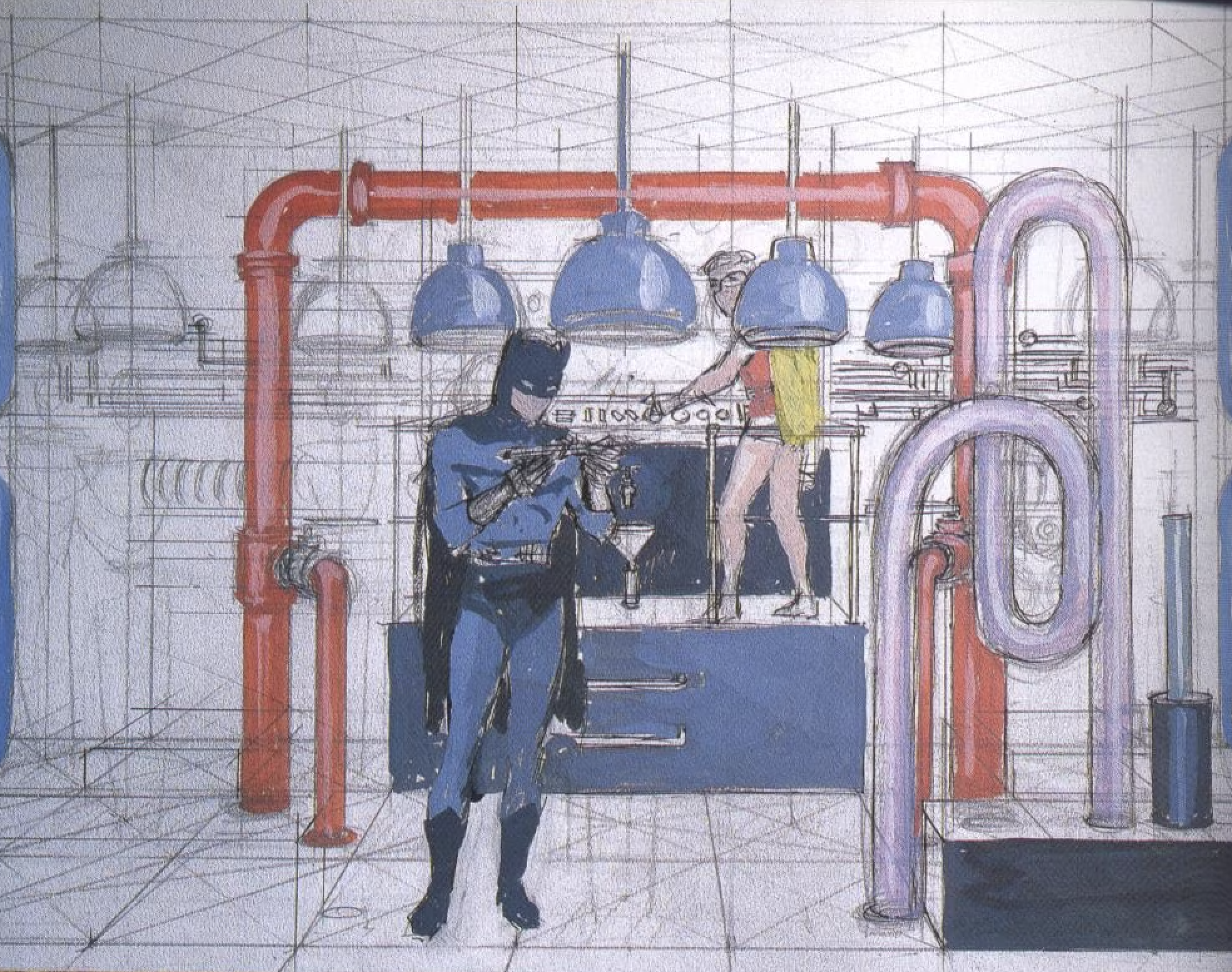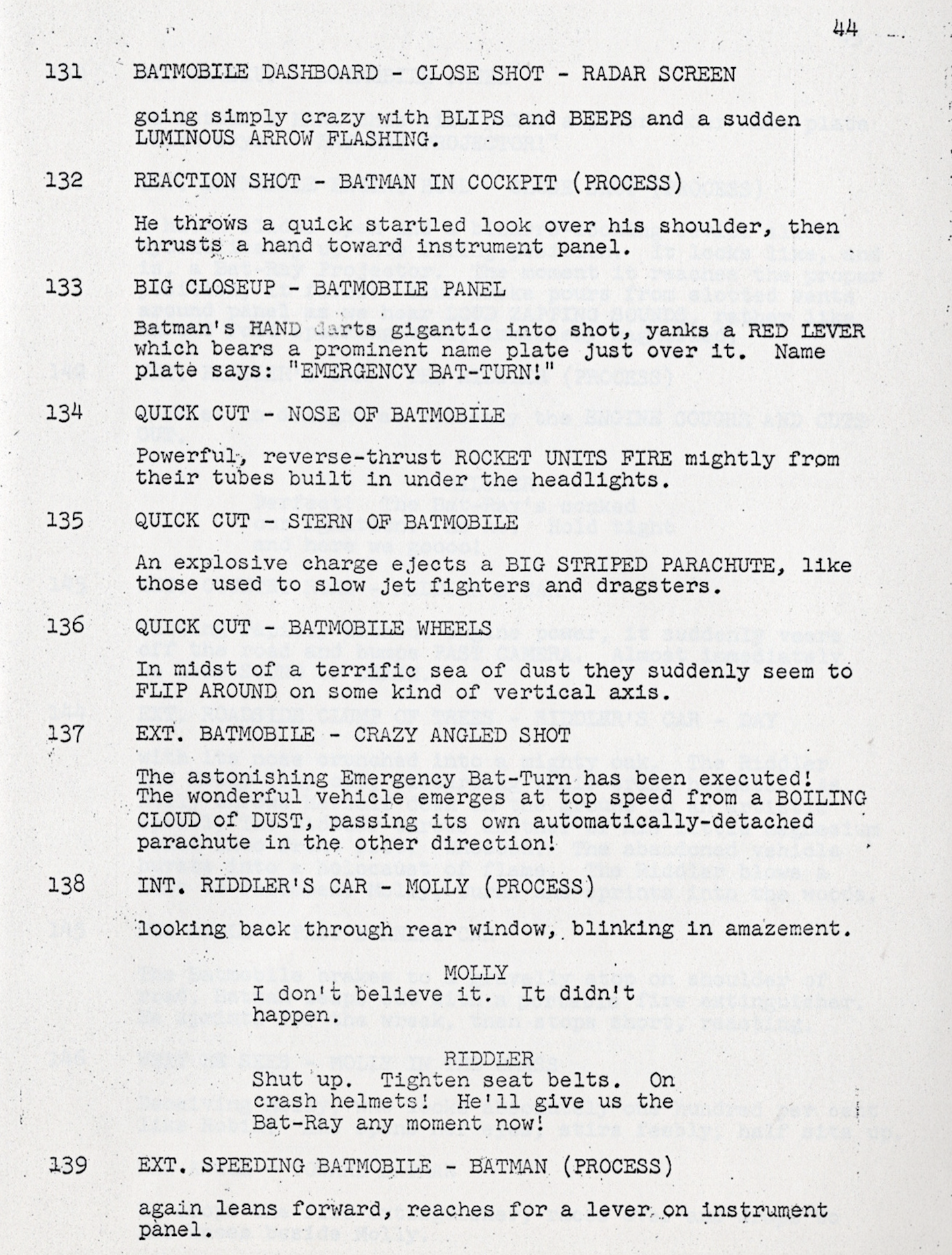 One change that I find very fascinating is Bruce and Dick’s familiar descent down the Batpoles, into the Batcave. I think most fans of the show have wondered how the Caped Crusaders actually got into costume between the mansion and the cave, and this script gives us more of an idea about how that happened, albeit in a vague, sort of abstract way.