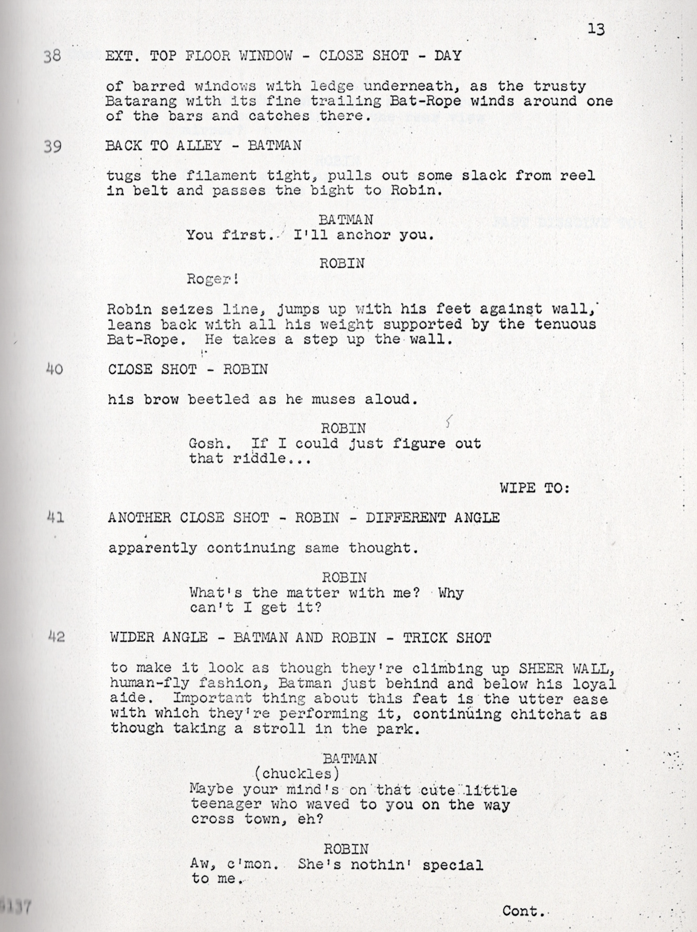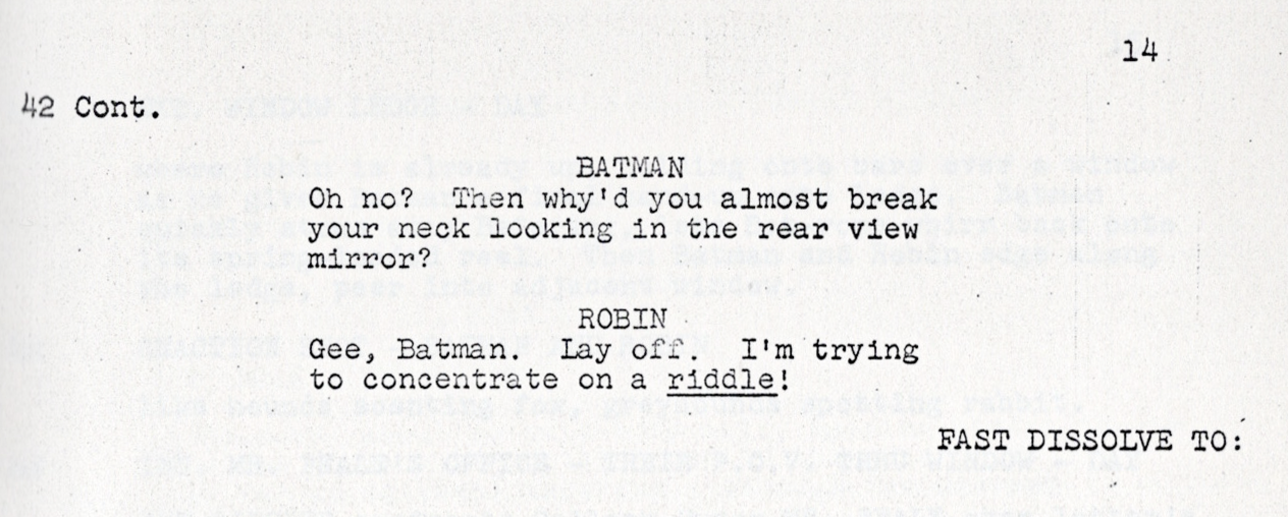 In the first-ever “Bat-climb,” Batman chides Robin about not being able to solve one of the Riddler’s clues due to the Boy Wonder having his mind on a cute girl that waved to him on their way to the Peale Art Gallery. In the aired version, Robin just responds “Aw, come on, Batman!” but in this draft, the Dynamic Duo’s exchange goes on a bit further.