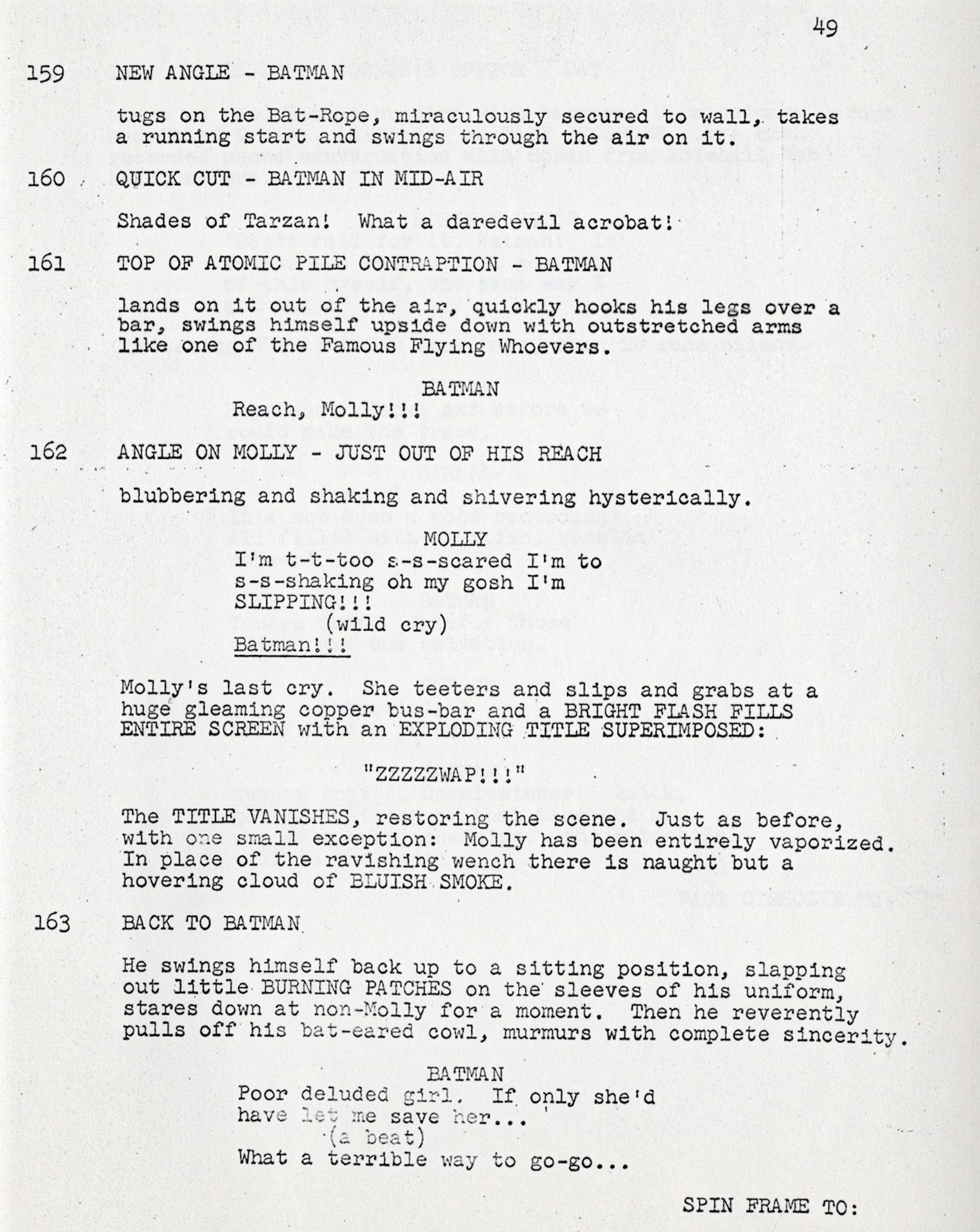 In this devastating scene where Molly, played by the vivacious Jill St. John, meets her demise, Semple described Batman swinging to her rescue in a heroic, Tarzan-like manner, up to the top of the atomic pile that powers the Batmobile, hooking his legs over a rail like a circus acrobat, and reaching for Molly upside down.
