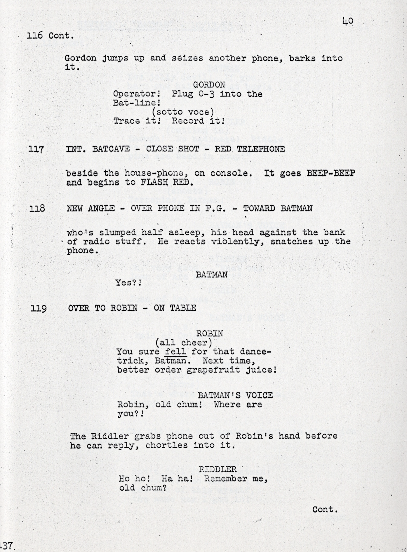 Also of note on this page is Scene 118, which describes Batman as being “half asleep,” waiting by the Batphone. In the aired version, we see him jump up from a chair when the phone beeps and flashes, but there’s no indication that he was half asleep.