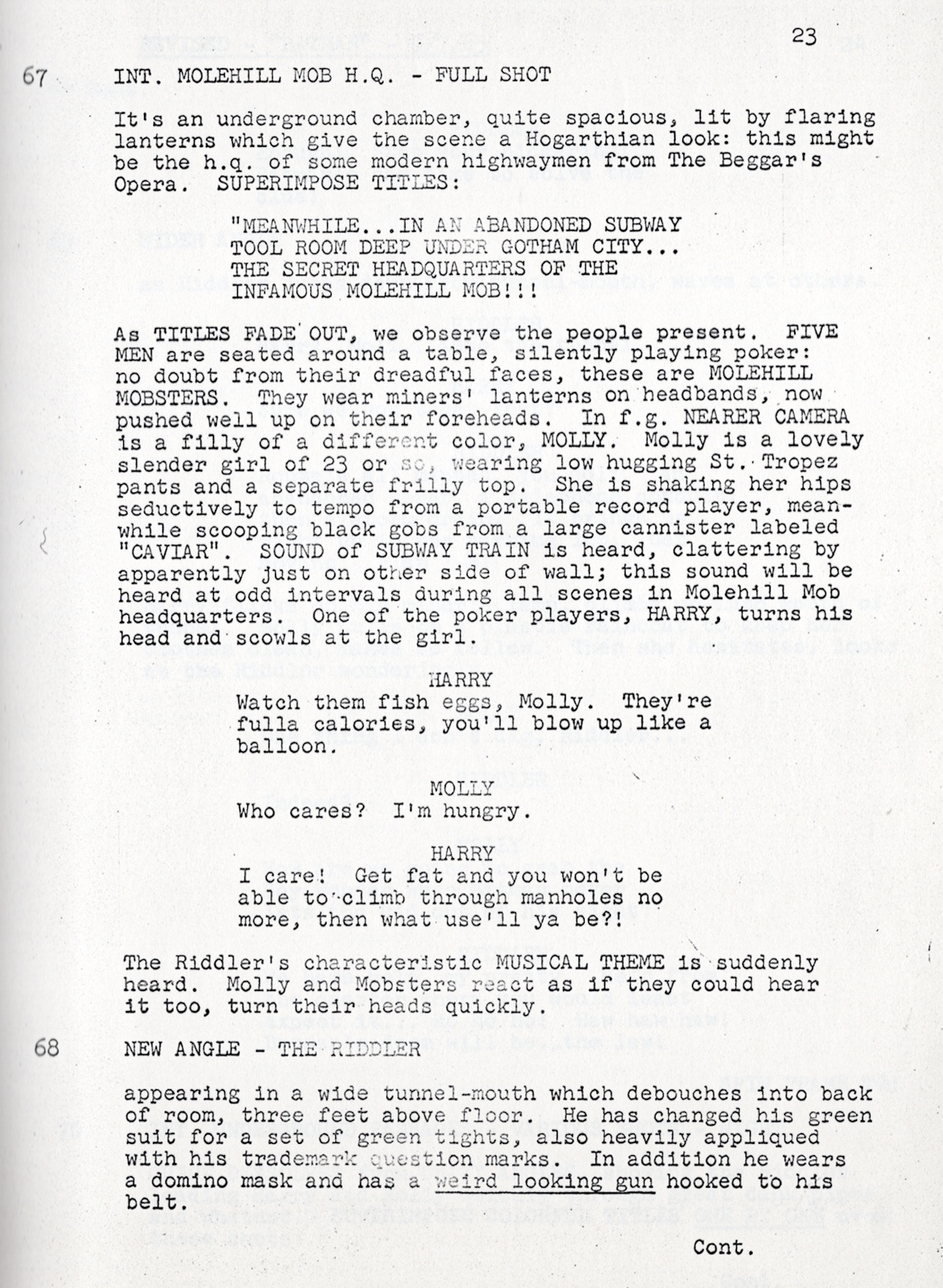 Another interesting change is not in the dialogue, but in the description of the Molehill Mob, the gang of thugs employed by the Riddler in this episode. In the filmed version, the gang is dressed like stereotypical mobsters, with their leader, Harry, in a pinstripe suit. But check out how Lorenzo Semple Jr. described them in this draft of the script.
