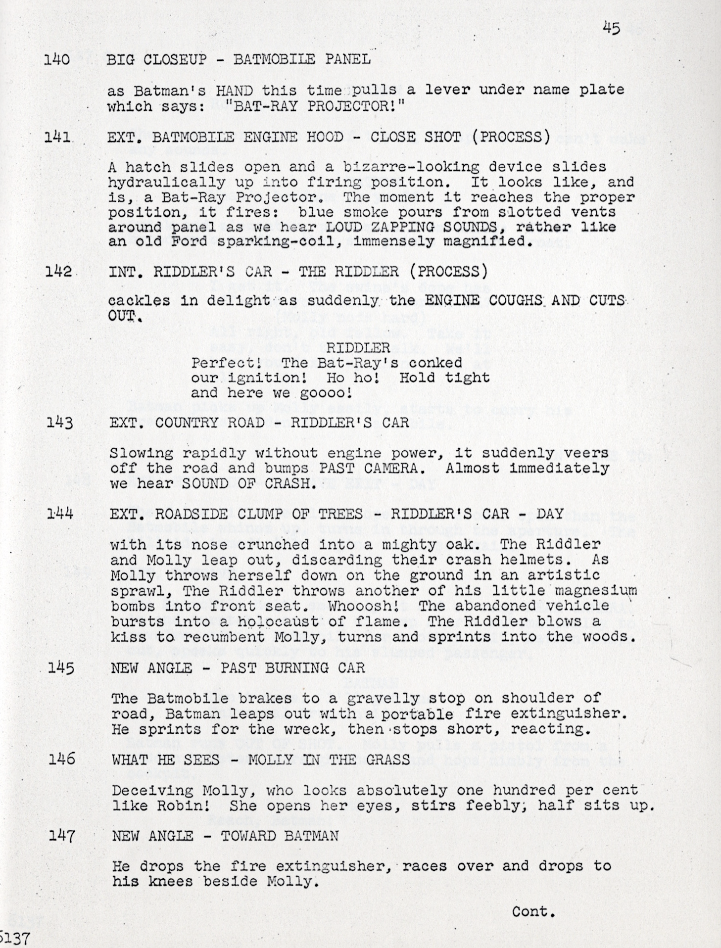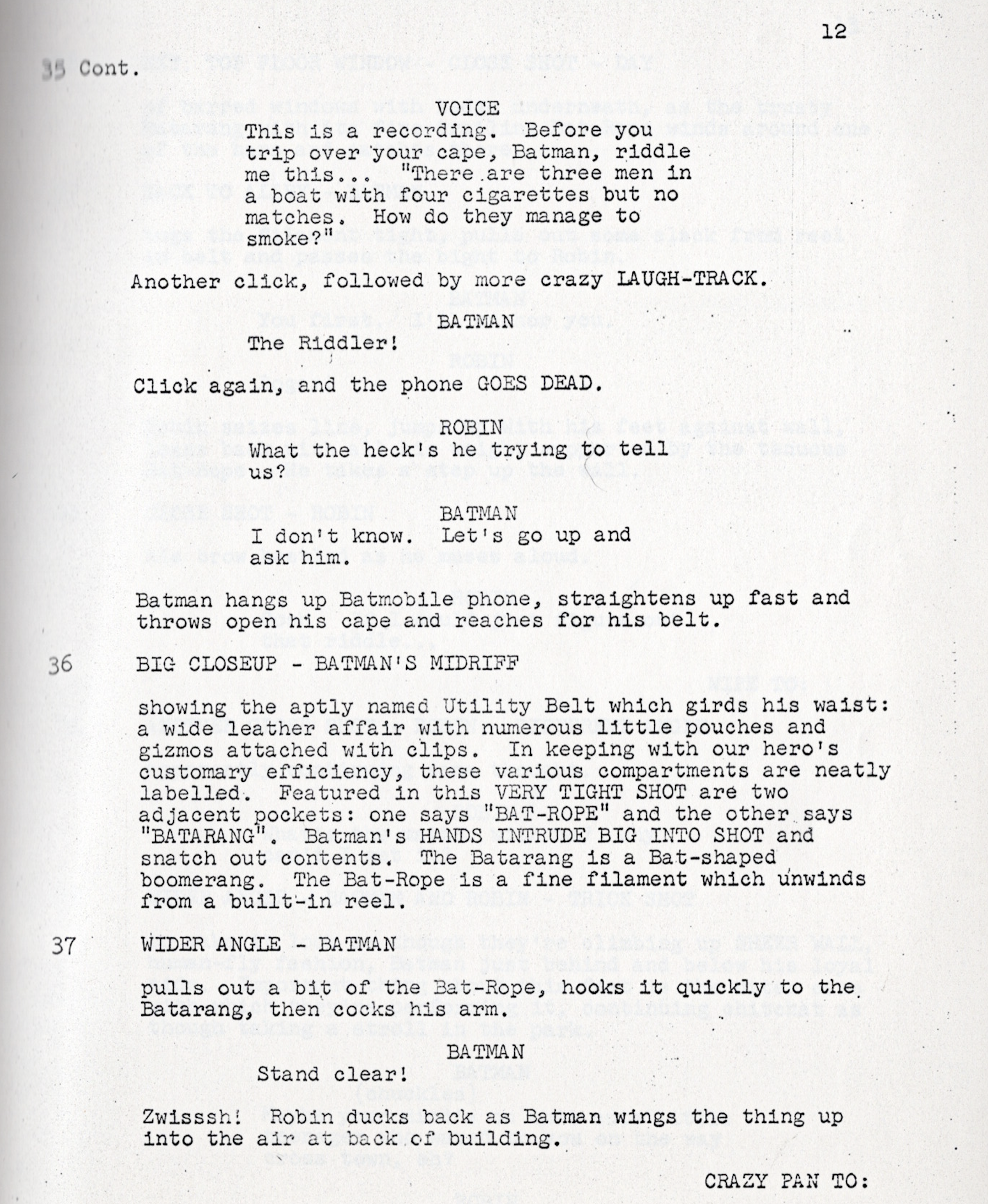 Also of note on this page is the description of the narration as “Superimpose Titles” rather than the iconic William Dozier voice-over that was established in the finished pilot.