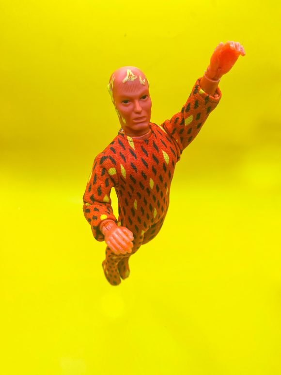 His bodysuit is a bit of a conundrum, using a stylized pattern of diamond-like black and yellow shapes over a red background. Not sure why Mego didn’t just print the standard comic vertical lines with some flames here and there, but it still reads “Human Torch” doesn’t it? I so wanted a Human Torch figure as a kid (which I could never find in stores), I cut out the image of him from the back of my Mego Spider-Man and played with it!