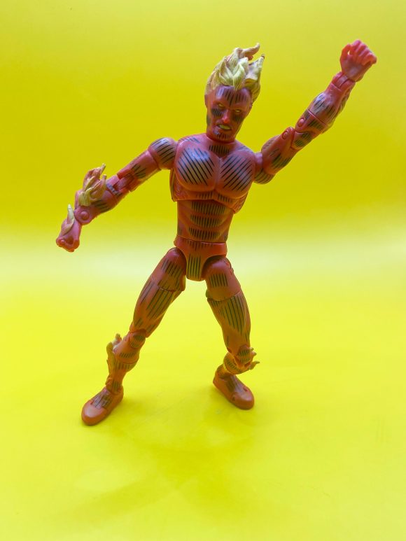 Human Torch – Marvel Legends (Toy Biz, 2002). By contrast, Johnny’s figure isn’t nearly as impressive, but still attempts to capture that comic look, while using a very generic, reusable body sculpt or “buck.” The added-on flames on his arms and legs help, as does the flaming “hair,” although the classic smooth-headed comics appearance is missed. The printed lines work to pull in the comics influence as well.