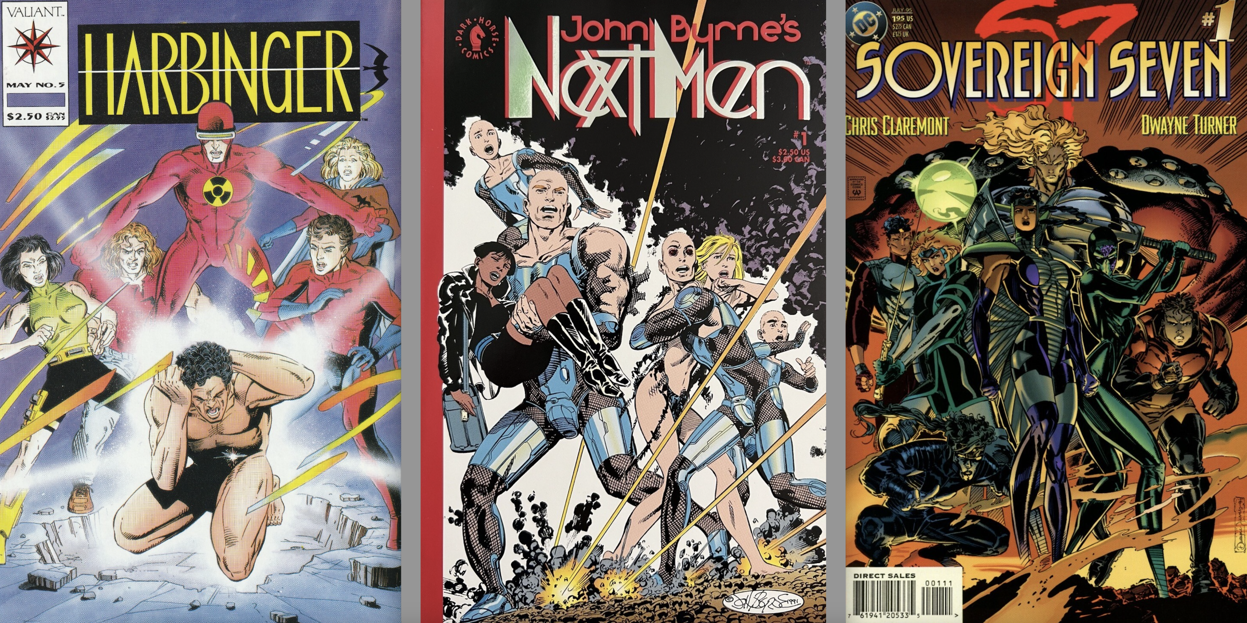 Jim Shooter’s HARBINGER (1990s, Valiant), John Byrne’s NEXT MEN (1990s, Dark Horse), Chris Claremont’s SOVEREIGN SEVEN (1990s, DC)