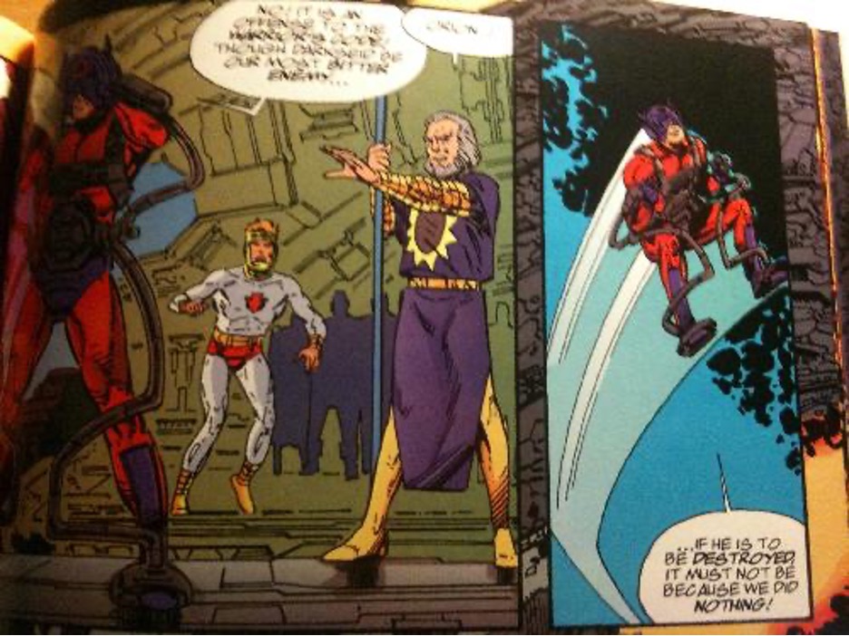 Of course, it’s not just Galactus and Darkseid mixing it up: Soon, others join the fray, namely Galactus’ herald the Silver Surfer and Darkseid’s estranged son Orion, who refuses to allow his father to be killed, over the objections of Highfather and the other New Gods.