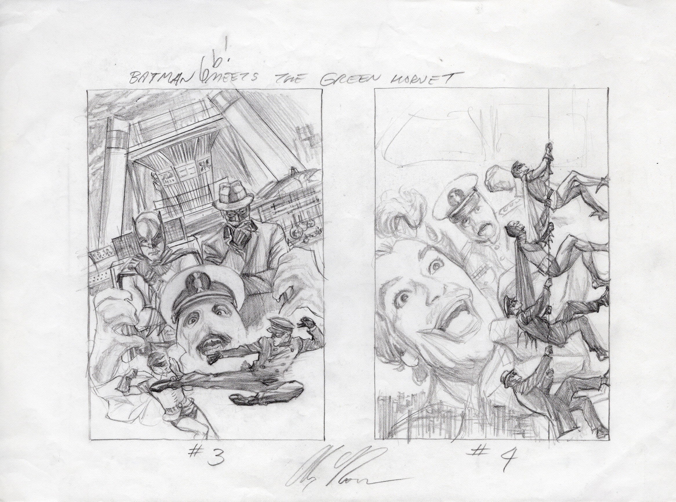 9. Alex Ross. Once DC began publishing a comic based on Batman, we all knew they had to do an issue that revisited the Season 2 episodes that featured the Green Hornet and Kato, A Piece of the Action/Batman’s Satisfaction. What we got was not just a single issue, but a whole mini-series sequel, written by Kevin Smith and Ralph Garman, no less, with incredible covers by Alex Ross and interior art by Ty Templeton! Here are two of Alex’s dynamic cover prelims on a single sheet.