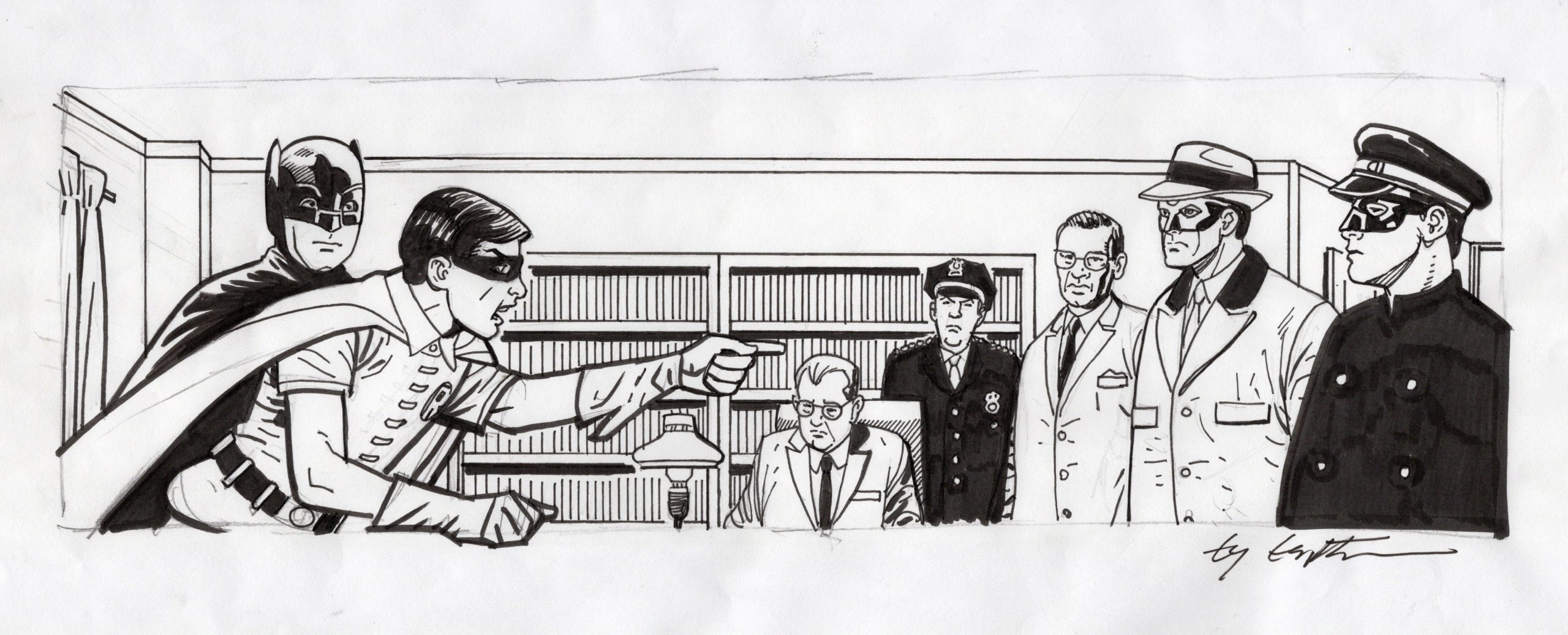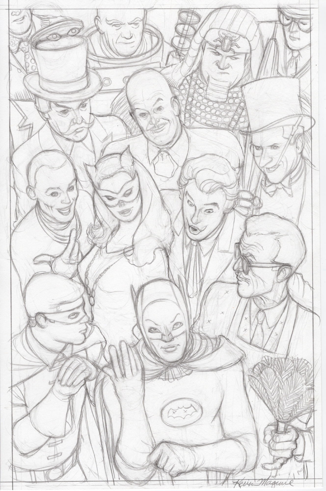 10. Kevin Maguire. The iconic cover to 1987’s Justice League #1 by Kevin Maguire has been parodied countless times, often by Maguire himself. Here is the pencil art for a print by Kevin, parodying the JL cover and featuring much of the cast of the Batman TV show.