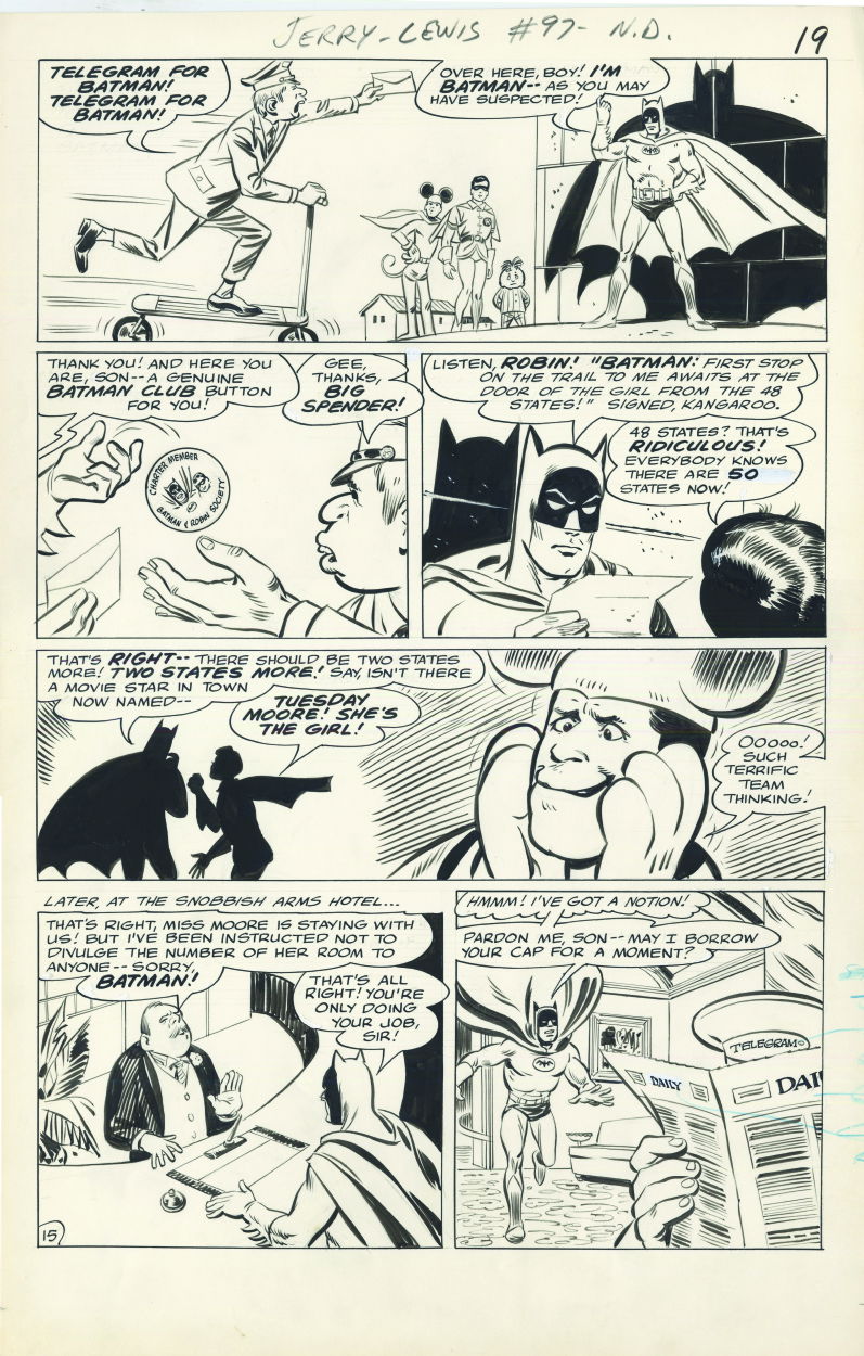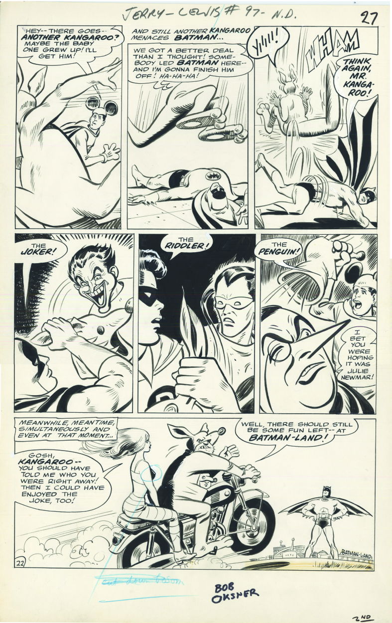 In September of 1966, Batman and Robin guest-starred in Issue #97 of DC’s long-running humor comic, The Adventures of Jerry Lewis, drawn by Oksner, and that’s the closest thing we got to a comic based on the Batman TV show in 1966. The Caped Crusaders, as portrayed in this issue, are obviously mirroring their campy TV counterparts in both the Arnold Drake script and the Oksner artwork.