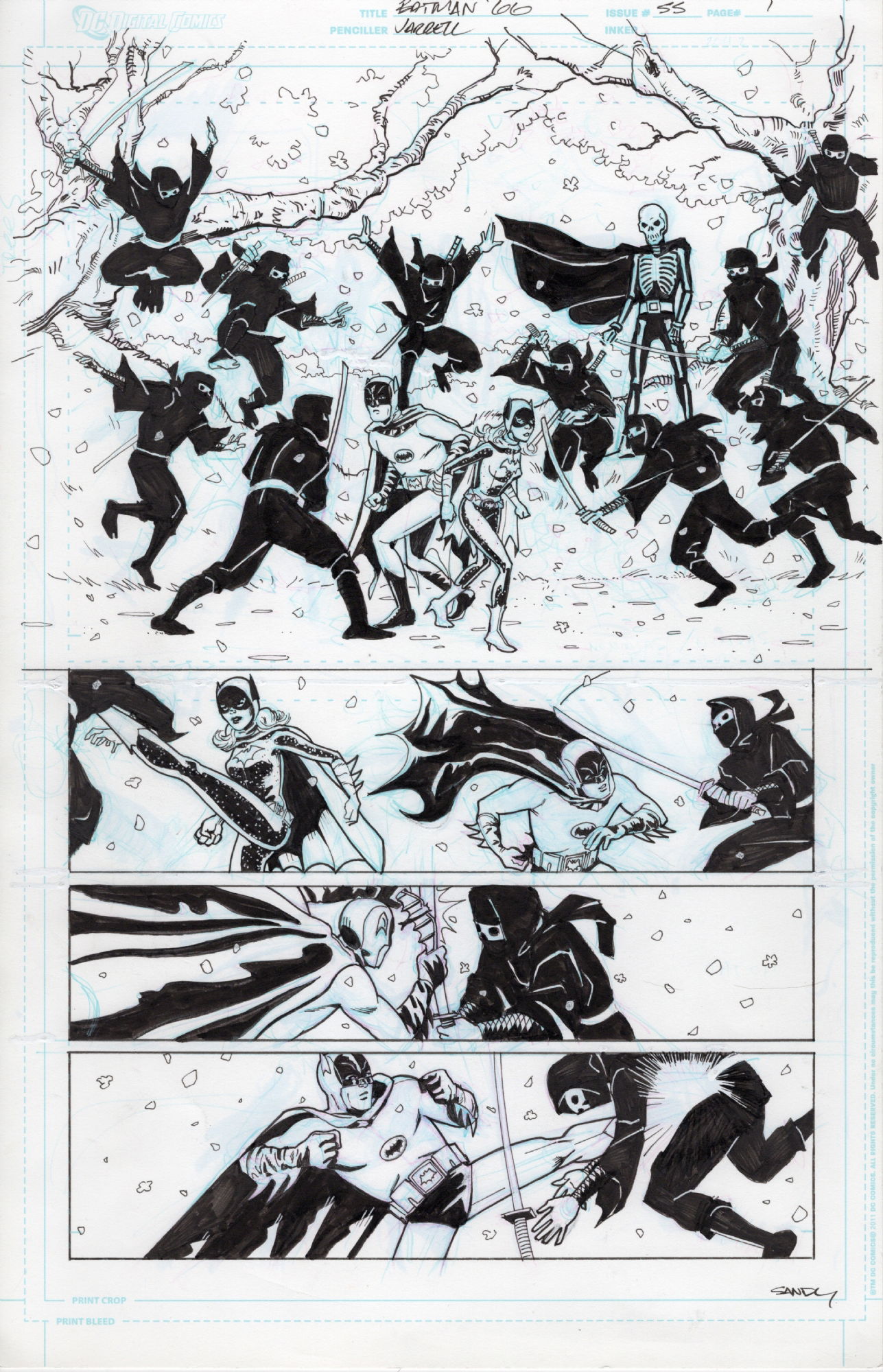 4. Sandy Jarrell. The villain of the issue in Batman ’66 #21 (along with the Penguin) was Lord Death Man, who first appeared as Death Man in Batman #180 in 1966. Sandy Jarrell was the artist for this issue, and also drew an unpublished homage to Gil Kane and Murphy Anderson’s famous original cover. Since Batgirl replaced an injured Robin on a trip to Japan in Jeff Parker’s script, Sandy drew another version featuring Death Man kicking Batgirl into an open grave instead of the Boy Wonder. Also in my collection are two published pages from the issue featuring Batman and Batgirl in battle with a horde of Lord Death Man’s ninjas.