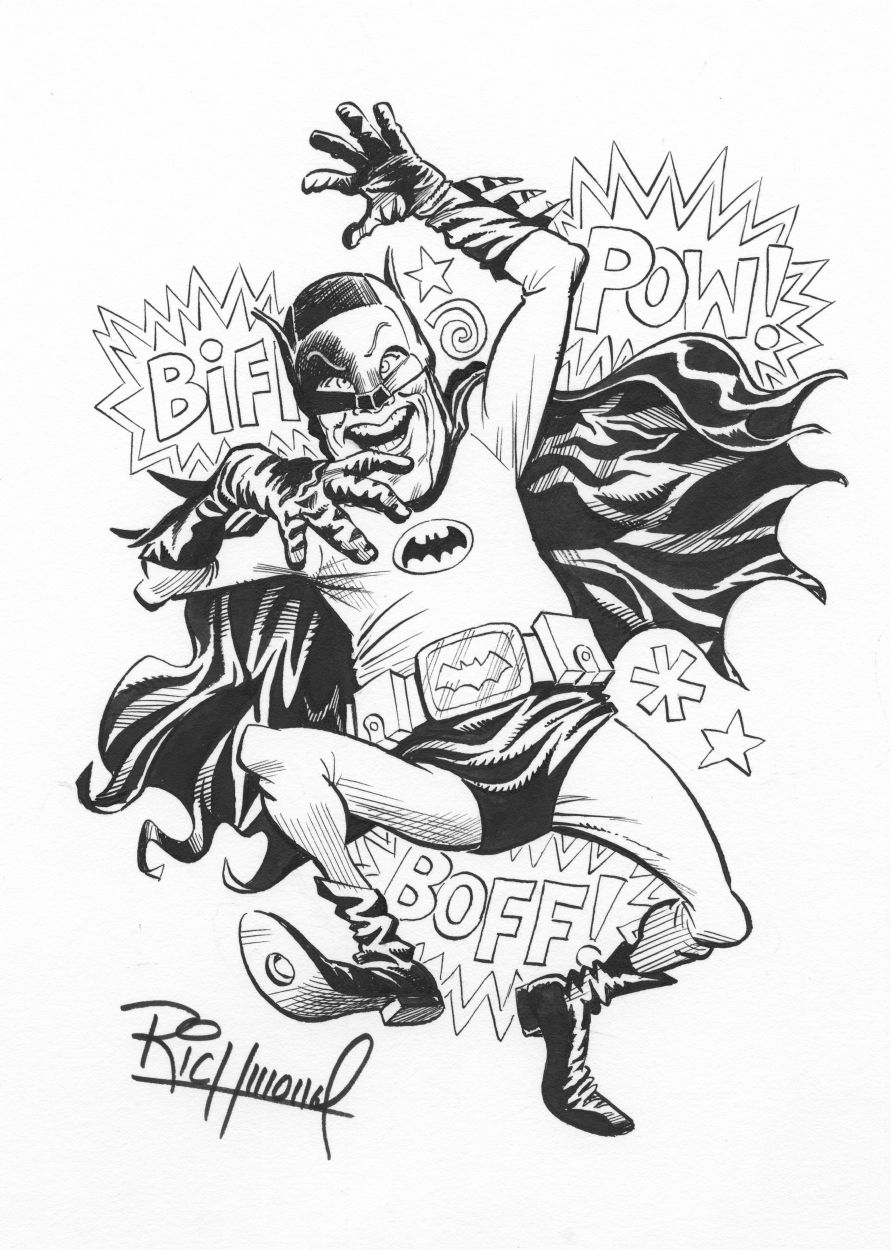 For my part, I’m observing the anniversary by sharing some original artwork from my Batman collection and highlighting 13 astonishing artists who drew the Dynamic Duo in the spirit of the TV show. (I also voted in the TOP 13 BATMAN ’66 EPISODE COUNTDOWN.)