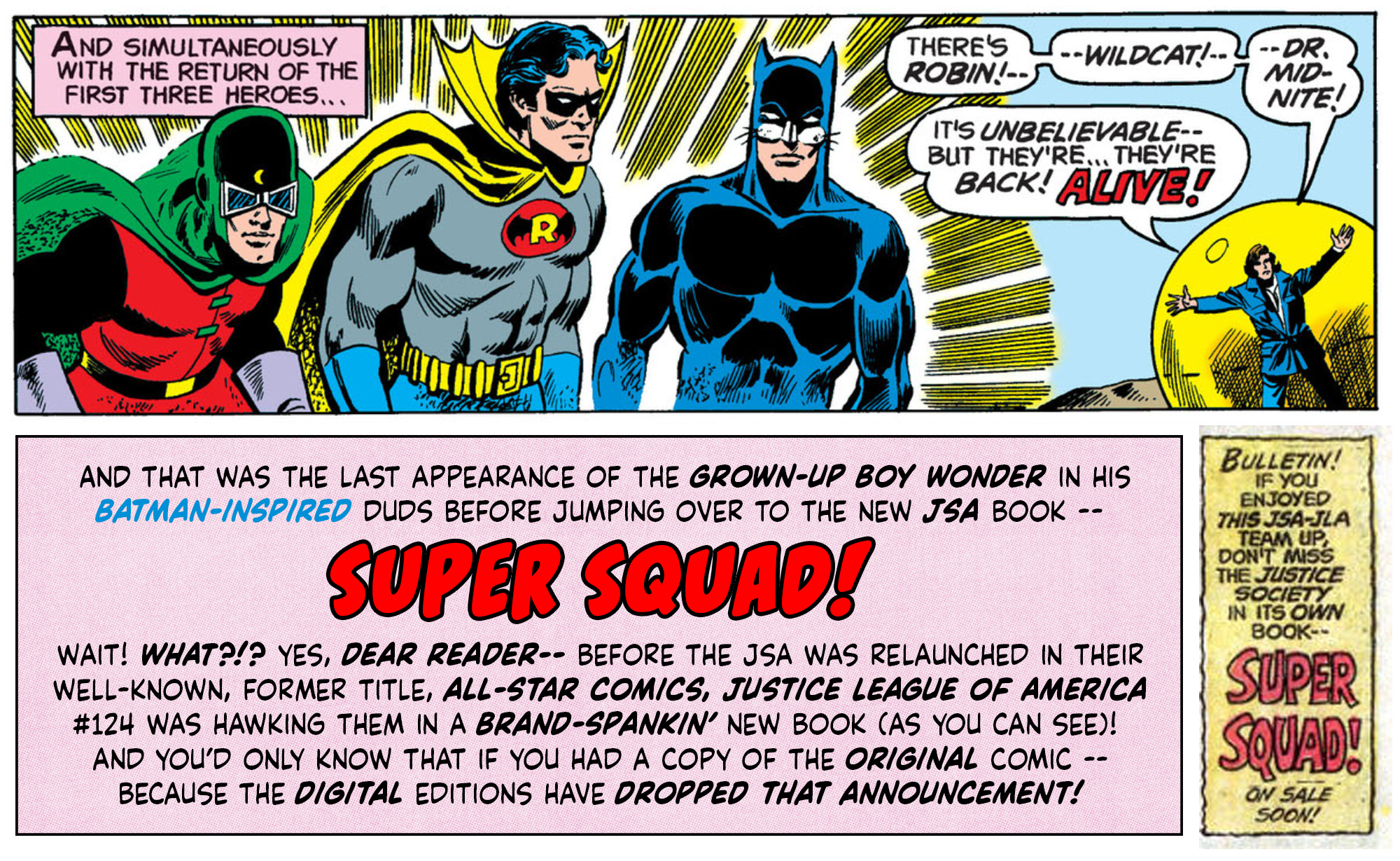 6. The Earth-Two Robin appeared sporadically over the next several JLA/JSA team-ups but ended up being cover-featured on 1975’s Justice League of America #124! That issue ended with the promise of something new but sadly it was not the continuation of Robin in his Bat-duds!