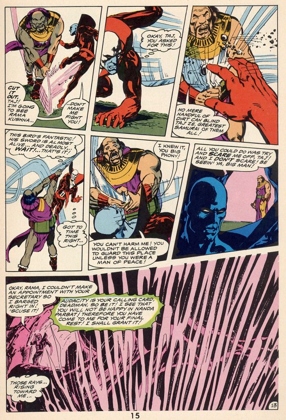 Today, letterers often scan their work and create a font that based on their style. Others use a font found in Photoshop that resembles hand lettering. When I entered the industry, I was told by Neal Adams that all dialogue and captions had to be the same font and the same size. There is nothing more confusing then reading a page with three or four fonts and multiple sizes. It takes you out of the story. And because display lettering is a lost art, sound effects are less exciting than they used to be. Neal would often letter his own sound effects as they wrapped around a character or looked like something completely unique. Take, for example, “Hey, a Jim Steranko Effect” from this Deadman story: Neal made the lettering look like smoke and you could only read it if you tilted the comic.