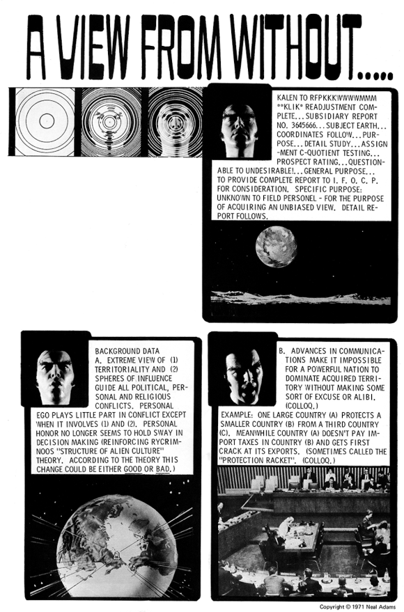Another example was when Michael Golden agreed to pencil and ink Continuity’s Toyboy #7. He insisted on a complete script that he would letter himself. Not only is the art amazing, but the lettering is inspired. His sound effects are absolutely incredible. The entire page is a work of art. Just like when Neal thought about reprinting his 1975 Thrillkill story, or his 1971 A View From Without. He insisted I (since I had studied lettering under him) re-letter the jobs. Watch the spacing, the letting, and don’t break up the words. Personally, I think they came out great and maybe someday they will be reprinted.