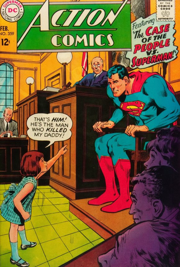 The lettering was often designed and inked onto the original page. In other cases, balloons and logos were on separate paper and rubber cement was used to stick them into place. This is when we had balloons on the covers to sell what was going to happen on the inside. These days, with poster-style covers necessitated in part by direct-market deadlines, there are very few word balloons, which, in my opinion, is a tragedy. Who doesn’t love the 1967 Action Comics #359 cover, where a little girl wails in a courtroom and points at Superman, “That’s him! He’s the man who killed my daddy!” It sure made me want to read that story.
