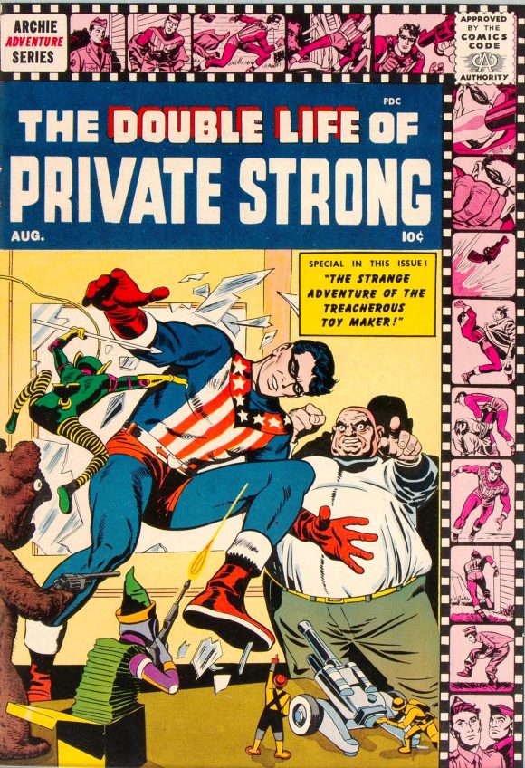 • Buck, it was Archie publisher John Goldman who cancelled The Double Life of Private Strong. He had received a cease and desist letter from DC layers who said he was derivative of Superman and chose not to go through the hassle.
