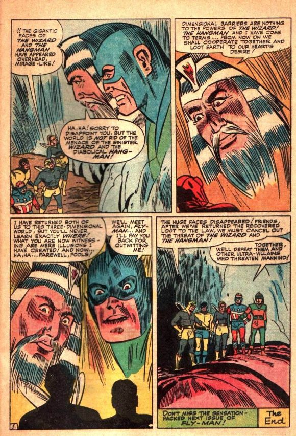 Archie Comics also reintroduced two of MLJ’s best heroes — the Hangman and the Wizard — in Fly Man #33 (Sept. 1965). The pair applied to join the Mighty Crusaders — but when the team recovered various loots from criminals and placed the riches in one location, the sight of it brought the newcomers’ overwhelming avarice to the forefront, turning them evil. Both were defeated but would show up again in The Mighty Crusaders #4.