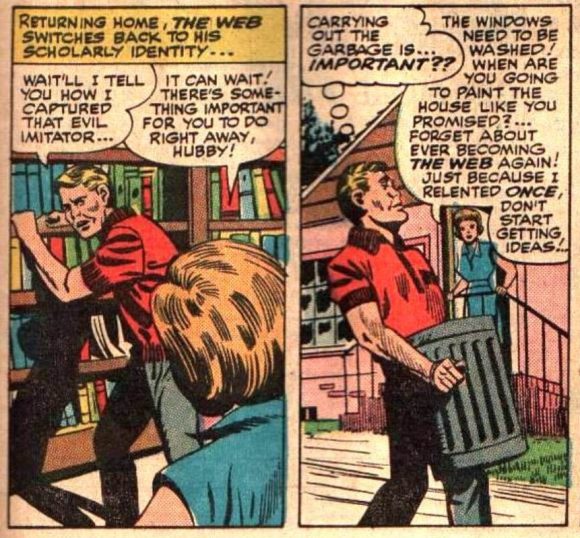 Another MLJ hero brought back prior to The Mighty Crusaders #4 was the Web, in Fly Man #36 (Mar. 1966), a character who was perhaps the weakest and most uninteresting of the bunch in his updated version. He had married and was forbidden by his wife, Rosie, to take up the Web identity. He had become a henpecked husband. Whether Archie Comics saw this as a humorous situation or not, the Web of the 1960s failed badly.