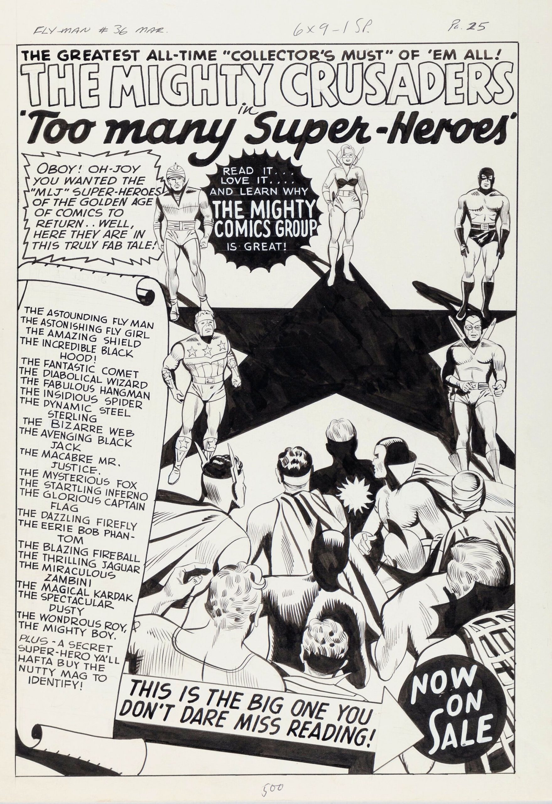 Original art for Fly Man #36 interior ad promoting The Mighty Crusaders #4. Art attributed to Paul Reinman.